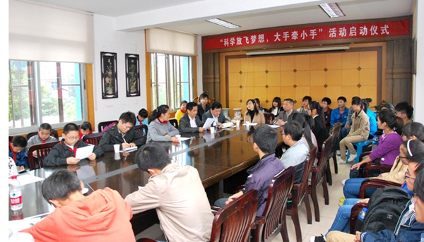 为了推动科学学科教学,提高小学生学习科学的兴趣和数学与计算科学学院科学教育专业大学生的教学实践能力,在安庆市科协的积极支持下,由我校数学与计算科学学院24位在校大学生和45位石化三小中高年级学生共同组成的“科学放飞梦想,大手牵小手”科学实践小组于10月24日正式成立,同主题的活动启动仪式于当日下午在石化三小三楼会议室隆重举行。安庆市科协副主席方朋华,数学与计算科学学院副院长余桂东副教授,石化三小校长管怀东及张国定教授出席开幕式。安庆师范学院大学生科普协会的部门会员及石化三小的学生代表共60余人也一同参加了活动启动仪式。