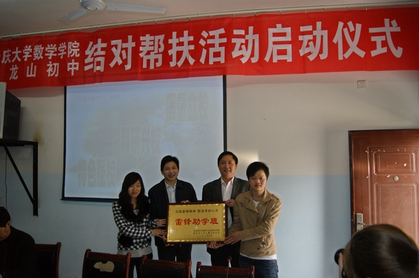 为响应校团委“实践雷锋精神,塑造美丽心灵”的号召,数学与计算科学学院数学与应用数学专业学生成立“雷锋助学班”,对大龙山中学学业困难的学生进行一对一帮扶。2012年3月28日下午,活动启动仪式在大龙山初中多媒体教室隆重举行。数学与计算科学学院党总支周其生书记、大龙山初中朱仁胜校长、金汪元书记等领导老师与大学生志愿者共同出席结对帮扶活动启动仪式并举行了“雷锋助学班”授牌仪式。周书记在讲话中要求参加此次帮扶活动的大学生志愿者学习要虚心、帮扶要细心、对待工作有恒心,面对学生有爱心,切实珍惜 “雷锋助学班”的实践机会,扎扎实实开展工作。朱仁胜校长代表学校向前来参加结对帮扶的20名大学生志愿者表示欢迎,他表示大龙山初中将安排班主任和相关教师全程跟踪服务,大力支持大学生志愿者开展帮扶工作。数学学院辅导员金海平老师宣读了此次帮扶活动的措施、目标和要求。