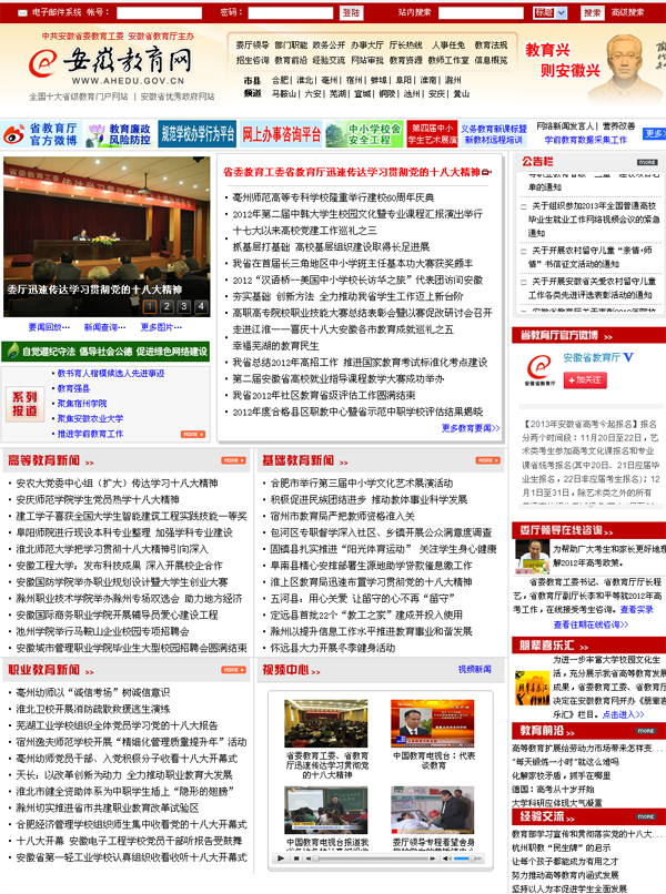 11月20日,安徽省教育厅门户网站安徽教育网在首页显著位置转发我院学生热学、热议十八大精神的新闻。我院高度重视十八大精神的学习宣传,6个学生党支部相继召开了学习座谈会。下一步,学院将根据学校的统一部署,组织好师生更好地开展好十八大精神的学习宣传、贯彻落实工作。