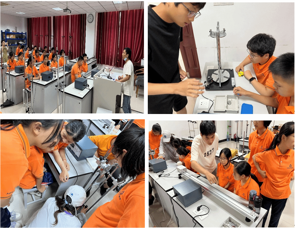 在力学实验室,刘佰生老师及其学生志愿者详细讲解了三线摆、复摆、弦振动等各种力学实验设备的原理和应用,并进行了精彩的实验演示。