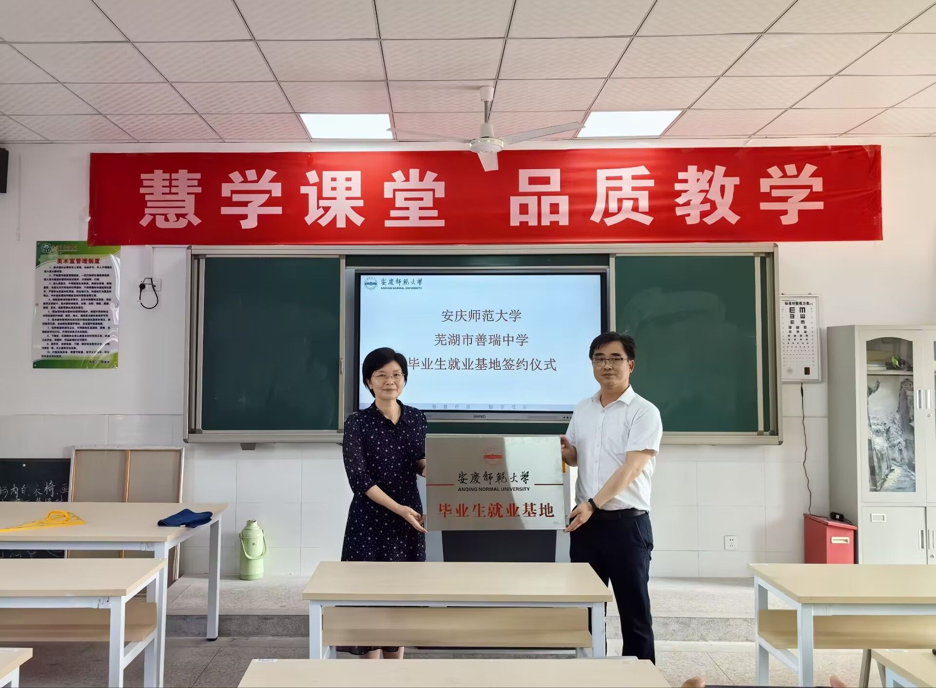 接着,学院一行又来到坐落在白马山下的芜湖市善瑞中学。善瑞中学校长许卫国表示作为一所农村学校,善瑞中学坚持以“培养特色,打造精品,办人民满意的学校”为指导思想,建立家校沟通机制,一直保持着高质量的教育教学效果,但学校也面临着诸多挑战,希望有更多留得住教得好的教师加入。彭芳珍表示学校坚持地方性,应用型,把乡村教育思想融入师范生培养过程,涵养学生积极投身乡村建设的情怀,学校多年开展师范生顶岗支教,为地方中小学输送了大批优秀师资。希望双方加强交流合作,实现互利共赢。最后,双方举行了毕业生就业基地授牌仪式。