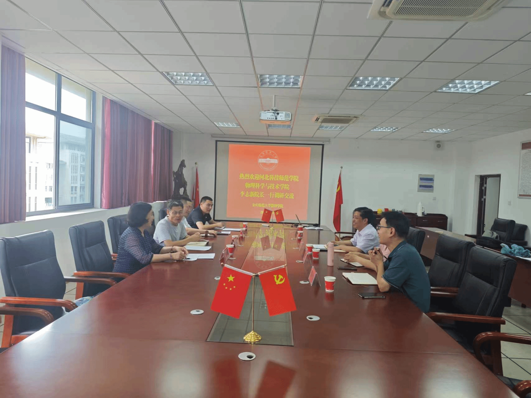 6月25日下午,河北科技师范学院物理科学与技术学院院长李志新、副院长辛伟、物理学专业教学部主任尹承红、副主任杨明超一行4人来我院调研交流。太阳成集团tyc234cc党委书记陆健、副院长张海、易明芳、学科物理硕士点点长张平伟等接待了河北科技师范学院一行。