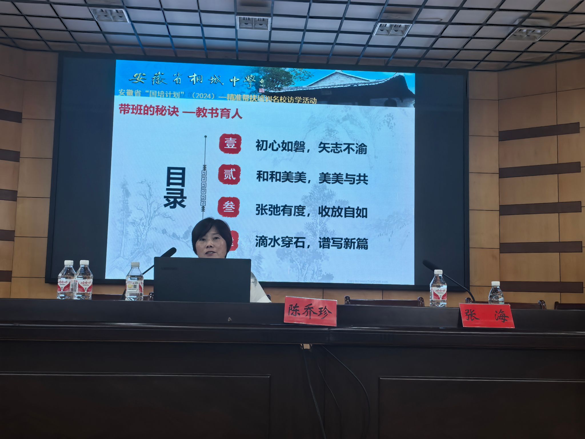 陈乔珍为名班主任班学员作了题为“如何做一个有智慧的班级引路人”的报告,与大家分享了自己二十二年的班主任工作经历。“初心如磐,矢志不渝”,教书育人必须以一颗进取的心加强阅读,要参加集体研讨,学习借鉴,随手记录工作日志;“和和美美 ,美美与共”,架起学生与任课老师之间的桥梁,培优补短,统一思想;“张弛有度,收放自如”,创建良性运行的班集体要求班主任做到以德立心、以情动人、以身作则,严而有格,爱而不纵。“滴水石穿,谱写新篇”以笃定之心、进取之志、博爱之情弘扬成人之道。