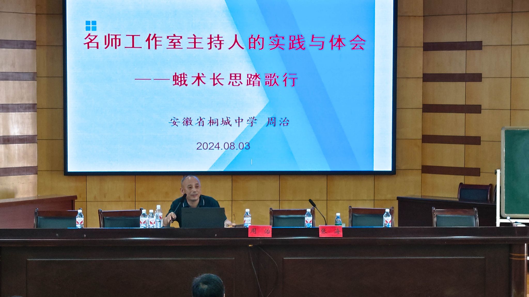 周治为名师班学员作了题为“名师工作室主持人的实践与体会”的报告,他以孙闻园先生为桐城中学题写的“蛾术长思”为切入点,从“我的教学模式”和“我的工作团队”两个方面与参训学员作交流分享。他指出,好老师不仅要在传道授业解惑的内容上要下足气力,也要在形式上下气力,注意方式方法,加强引导,遵从适应,点燃学生、激励学生、唤醒学生。团队工作实现共赢,就必须以“实干”的态度奠定坚实基础,用“规划”思想引领方向,通过“研究”行动不断优化策略,并秉持“学习”习惯持续提升自我与促进团队成长。