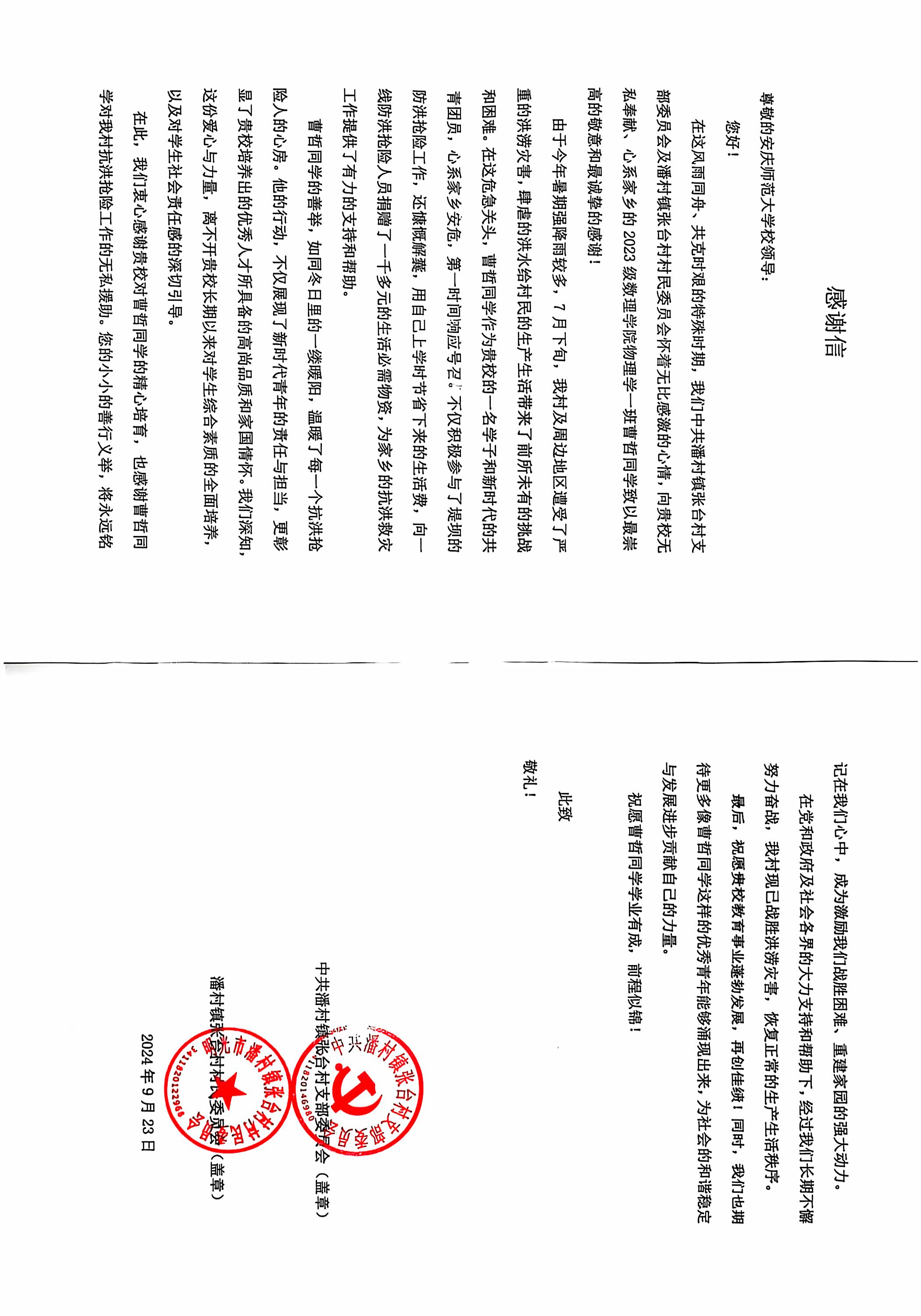 10月14日,太阳成集团tyc234cc收到了一封来自安徽省明光市潘村镇张台村党支部的感谢信,信中对该院2023级物理学专业1班曹哲同学在今年夏季防汛救灾工作中所展现出的勇敢担当、无私奉献和高度的社会责任感表示深切的敬意和衷心的感谢。