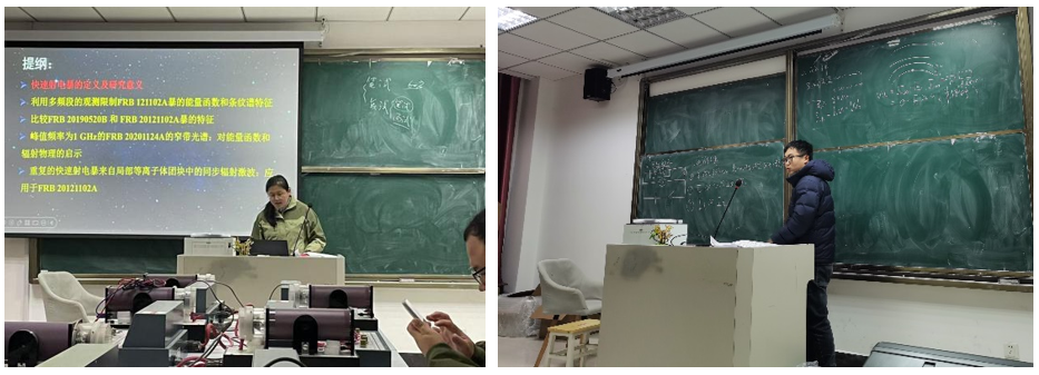 为帮助青年教师在科研上有更好的发展,发挥朋辈示范引领作用,吴主任特邀请了国家基金获得者吕芬博士做题为“基于多频段观测探究快速射电暴的光谱特征、能量分布及背后的辐射机制” 学术报告。吕芬博士报告了她攻读研究生以来的研究进展,分享了她的研究方法和研究思路,并将自己的科研背景与物理学专业英语中的天体物理知识串联,为大家介绍了重复快速电磁爆(FRB)以及其源在宽频段的辐射特性,很好地将科研融入到本科教学中。