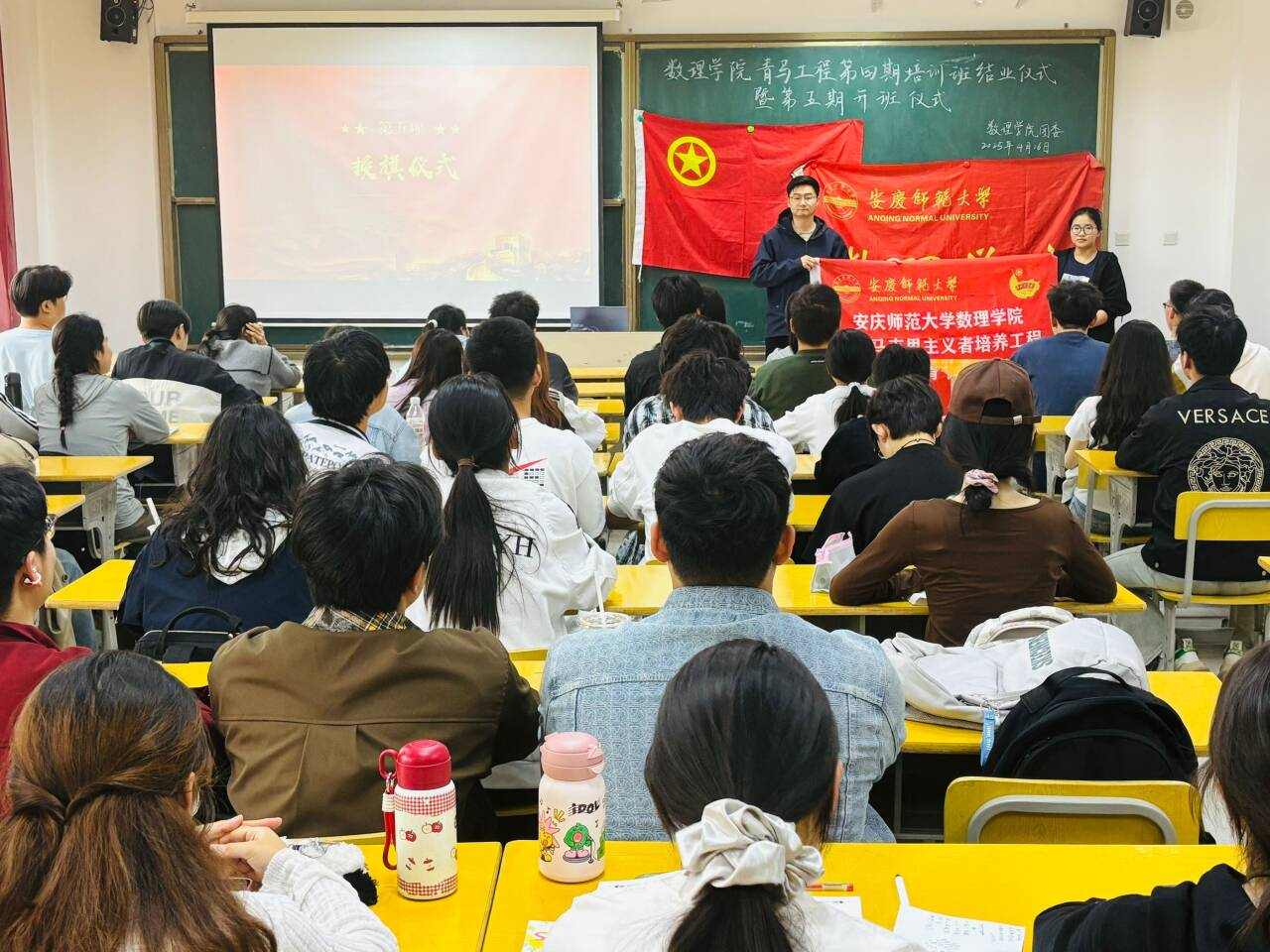在激昂的国歌声中,仪式拉开帷幕。应用统计学专业2022级(2)班何烨同学作为第四期“青马工程”优秀代表发言,她从理论学习、实践活动和个人成长等多个角度分享了在培训期间的收获,展现了扎实的理论基础和出色的实践能力。2024级数学稼先班喻静恬作为第五期“青马工程”培训班学员代表发言,她的每一句话都流露出对“青马工程”培训班学习的渴望,激发了新学员们的学习热情。她立志在青马班的学习中不断成长,成为一位有理想、有担当、有责任感的青年马克思主义者,为实现中华民族伟大复兴的中国梦贡献力量。