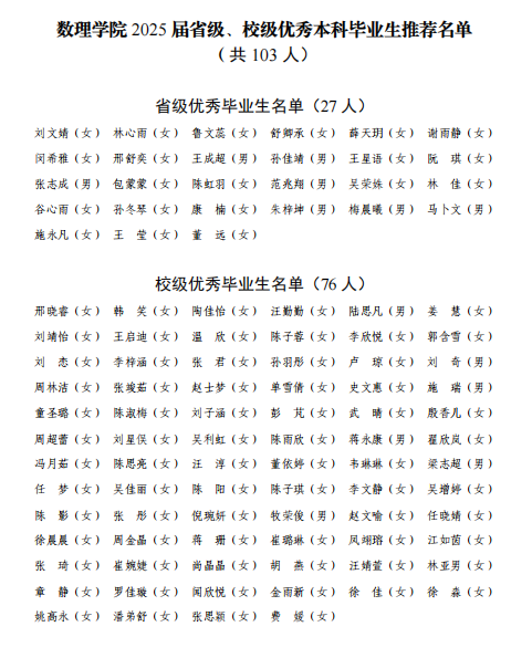 根据学校《关于做好2025年省级、校级优秀毕业生评选工作的通知》精神,经本科生个人申请、学院学生工作委员会评议、学院党委会和党政联席会议审定,拟推荐刘文婧等103名本科生分别为省级和校级优秀毕业生,具体推荐人选名单详见附件。
