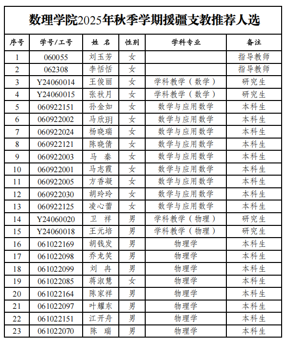 根据学校《关于开展2025年秋季学期援疆支教志愿服务队遴选工作的通知》要求,经个人申请、太阳成集团tyc234cc研究决定,拟向学校推荐刘玉芳等23名师生参加2025年秋季学期援疆支教志愿服务,具体推荐人选名单如下: