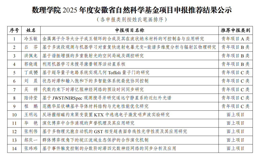 根据学校《关于开展2025年度安徽省自然科学基金项目申报工作的通知》精神和要求,经个人申报、学院学术委员会评审、学院党政联席会议审定,拟推荐冷玉敏等14位教师申报2025年度安徽省自然科学基金项目,现予以公示: