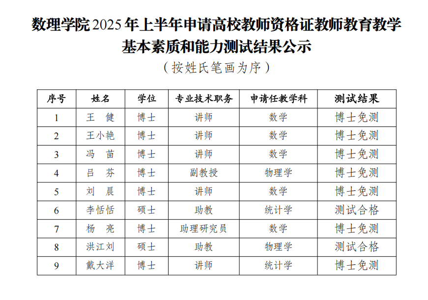 根据学校《关于开展2025年上半年高校教师资格认定工作的通知》精神和要求,经个人申请、学院考核,现将学院2025年上半年申请高校教师资格证的9名教师教育教学基本素质和能力测试结果公示如下: