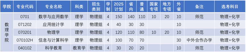 大学生数学建模竞赛、数学竞赛和全国大学生物理实验竞赛已成为学校的一张闪亮名片,全国大学生“挑战杯”、中国大学生物理学术竞赛等科技创新实践活动捷报频传,加速度“a”阳光长跑领跑、“文明从我做起,课堂拒绝手机”、“天文科普与观测”等学生活动品牌在全校推广。学院2023-2025三届硕士研究生考取博士15人。大学生数学建模竞赛、数学竞赛、全国大学生物理实验竞赛已成为学校的一张闪亮名片,全国大学生“挑战杯”、中国大学生物理学术竞赛等科技创新实践活动捷报频传,加速度“a”阳光长跑领跑、“文明从我做起,课堂拒绝手机”“天文科普与观测”等学生活动品牌在全校推广。学院本科毕业生考研录取率高、就业率高, 其中在2015-2025届毕业生中,超过1200名同学分别考取复旦大学、上海交通大学、浙江大学、中国科学技术大学、东南大学、武汉大学、华中科技大学、山东大学、东北大学、兰州大学等高校研究生, 目前有多位学子赴美国、加拿大、英国等高校攻读硕士、博士学位。