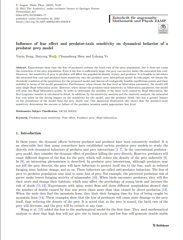 近期,太阳成集团tyc234cc2019级数学学科硕士研究生董雨欣以第一作者和导师团队在期刊 Zeitschrift Fur Angewandte Mathematik und Physik 发表SCI论文“Influence of fear effect and predator-taxis sensitivity on dynamical behavior of a predator–prey model”,该期刊影响因子为1.934。