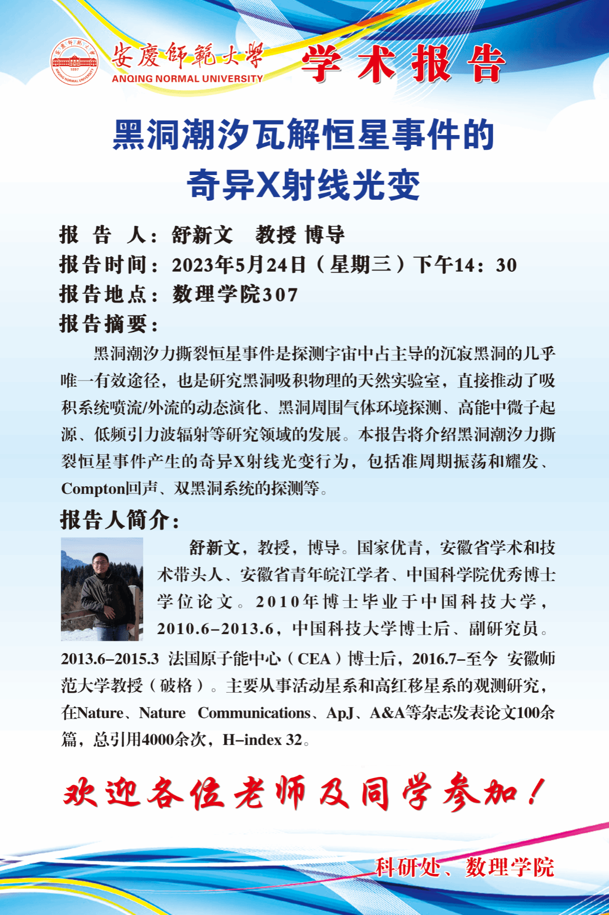 安徽师范大学舒新文教授应邀作题为“黑洞潮汐瓦解恒星事件的奇异X射线光变”的学术报告预告