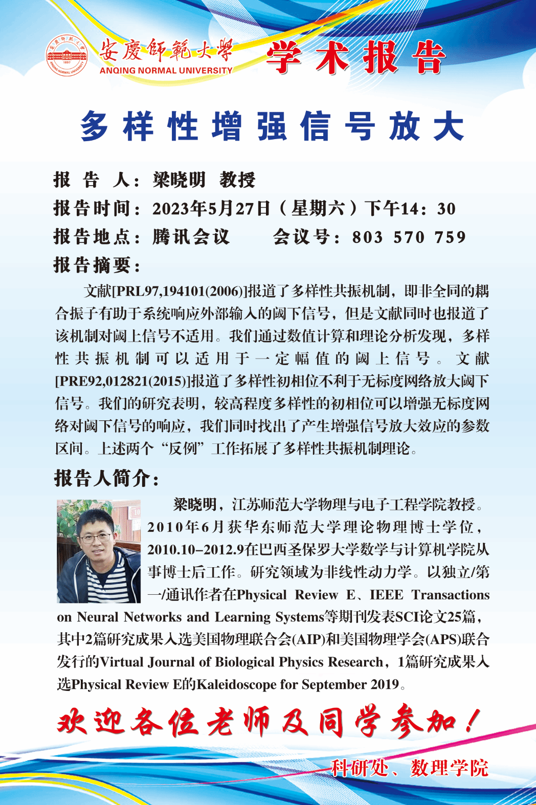 江苏师范大学梁晓明教授应邀作题为“多样性增强信号放大”学术报告的预告