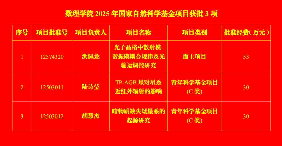 8月27日,国家自然科学基金委员会公布了2025年度国家自然科学基金项目的评审结果,太阳成集团tyc234cc洪佩龙副教授、陆诗莹博士和胡慧杰博士分别获批2025年度国家自然科学基金项目。洪佩龙副教授获批国家自然科学基金面上项目(项目号12574320,获批经费53万元),陆诗莹博士获批青年项目资助(项目号12503011,获批经费30万元),胡慧杰博士获批青年项目资助(项目号12503012,获批经费30万元)。