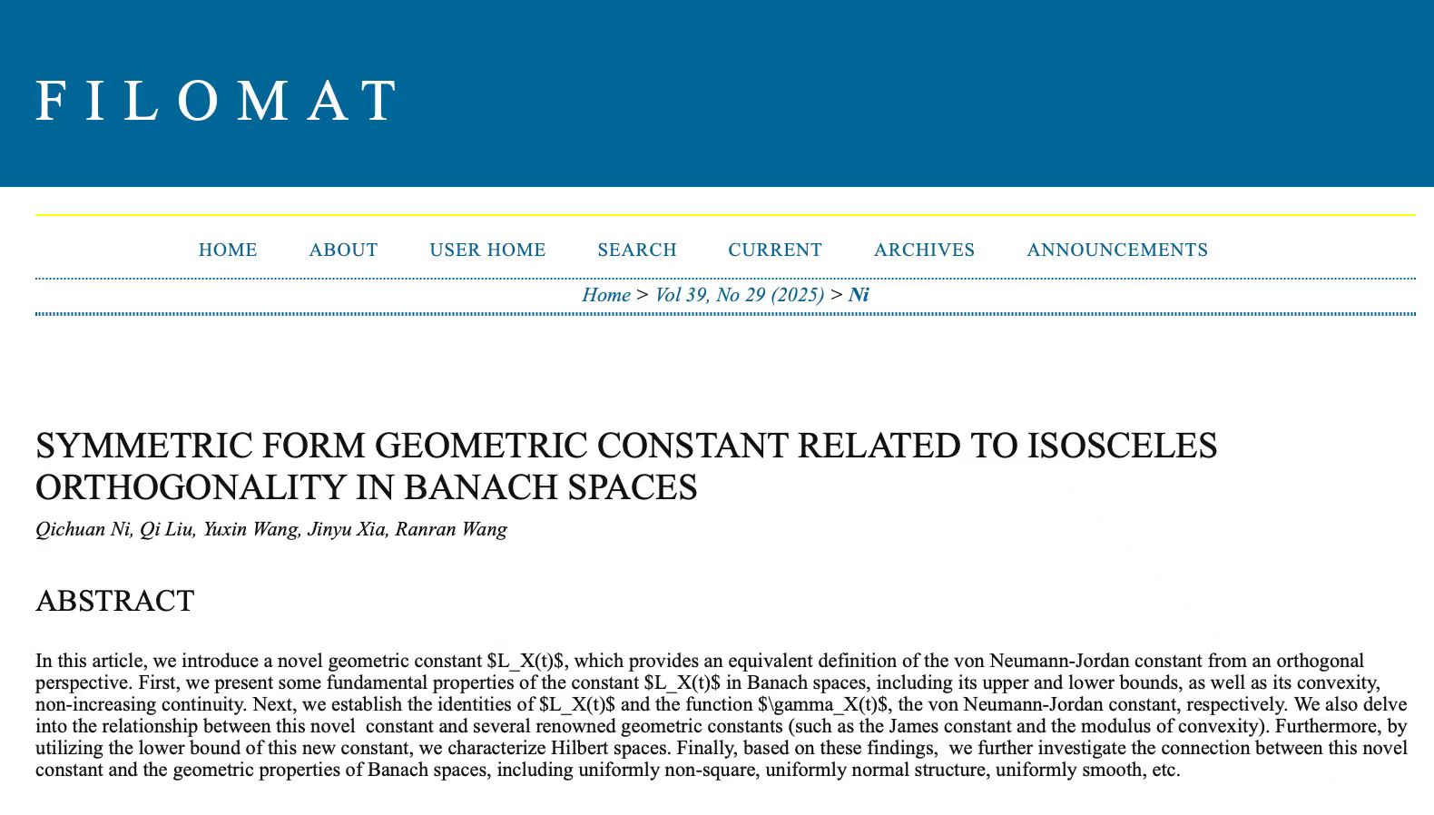 近日,太阳成集团tyc234cc数学与应用数学专业2022级本科生倪其川同学,以第一作者撰写的论文被学术期刊《Filomat》接受发表,该期刊JCR二区,中科院四区。该论文的通讯作者为太阳成集团tyc234cc刘琪博士,2022级数学邓稼先班汪冉冉同学为论文合作者。本篇论文是倪其川同学在学业导师刘琪博士指导下发表的第三篇SCI学术论文。