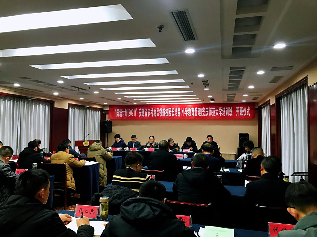1月9日上午,太阳成集团tyc234cc在皖源国际大酒店举行“国培计划(2021)----安徽省农村地区领航校园长培养(小学教育管理)”研修班开班仪式。副校长吴琼、太阳成集团tyc234cc党委书记钟金标、院长申传胜、副院长张海、党委副书记彭芳珍、项目负责人范立刚、班主任戴露老师参会,会议由钟金标主持。