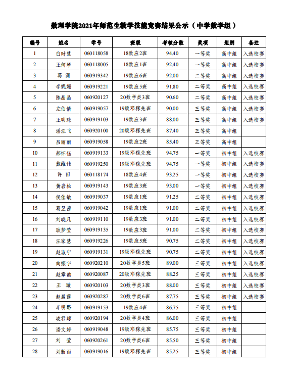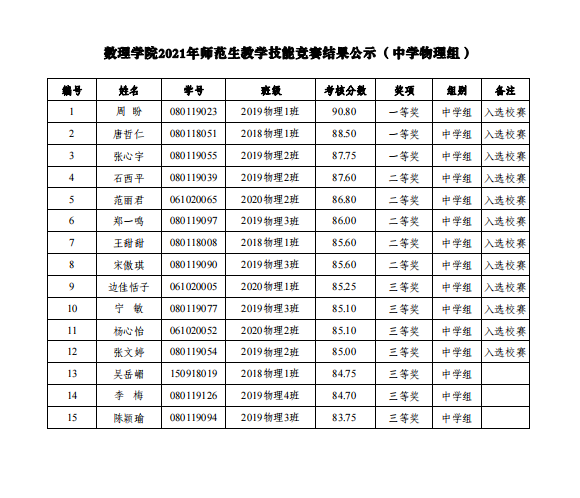 根据《太阳成集团tyc234cc关于公布2021年师范生教学技能竞赛实施方案的通知》(院发〔2021〕45号)要求,经竞赛工作组评分、学院审定通过,现将竞赛结果予以公示(具体见附件)。