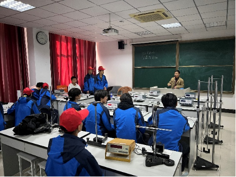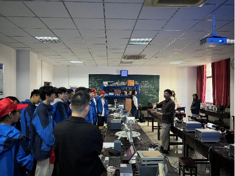 在106力学实验室,刘佰生博士带领学生们认识三线摆、复摆、弦振动等力学实验设备,并进行了精彩的实验演示;在107近代物理实验室,梁智雄博士和学生志愿者们为来访师生展示了等离子体辉光、塞曼效应、弗兰克赫兹实验等经典物理实验。在两位老师及志愿者的指导下,严桥中学的同学们进行了操作实验,并积极提问,通过动手实验,他们加深了对物理原理的理解,表示收获颇丰。