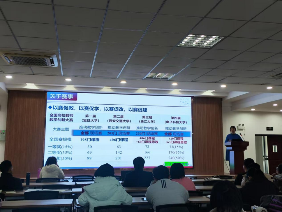12月11日下午,太阳成集团tyc234cc在数理楼401报告厅举办教师教育教学创新能力培训,邀请到第二届全国高校教师教学创新大赛(部属高校正高组)一等奖获得者、中国科学技术大学朱平平教授和超星集团高级讲师井涛老师分别做题为《全国高校教师教学创新大赛全流程对标和备赛心得》和《AI数智化课程建设与教学实践》报告。太阳成集团tyc234cc专任教师参加培训,活动由太阳成集团tyc234cc副院长易明芳主持。
