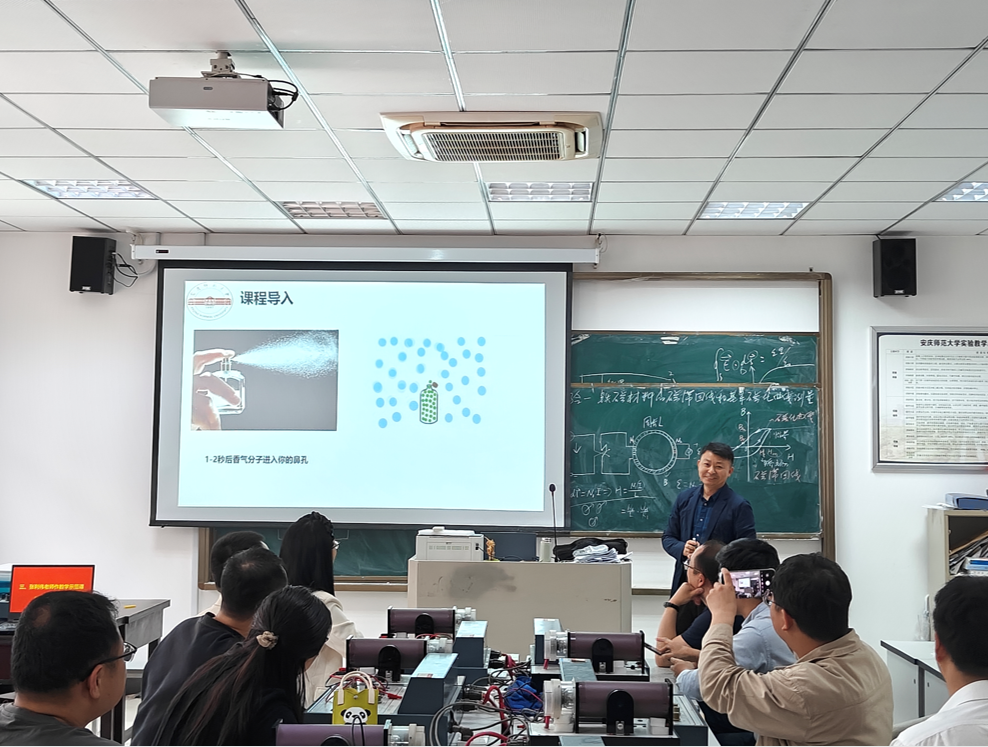 在示范课环节,大学物理与科学教育党支部书记张利伟教授以《热学》课程中的“气体分子平均自由程”为题进行课程教学示范。他通过生活化案例——“香水分子扩散”导入,呈现了一堂生动高效的互动式课堂,教研室各位教师一致认为该示范课为创新教学方法提供了有益借鉴,其新颖的教学方法和良好的教学效果为青年教师提供了有益指导。