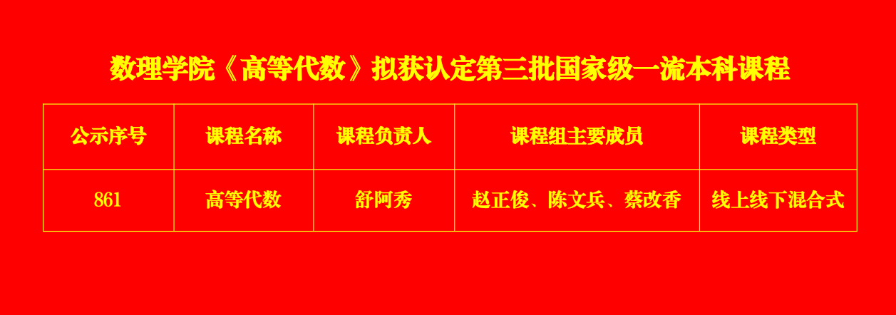近日,教育部公示了第三批国家级一流本科课程认定结果,太阳成集团tyc234cc舒阿秀、赵正俊、陈文兵、蔡改香团队的《高等代数》课程拟获认定为国家级一流本科课程(线上线下混合式)。这是太阳成集团tyc234cc课程建设取得的重大突破。