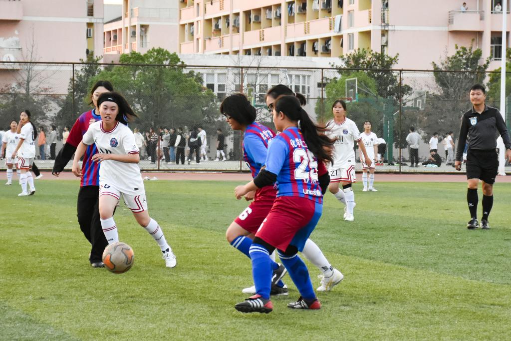 天色渐暗,秋风凌冽阻挡不了场上队员们的热情。当裁判一声哨响,红白相间的身影在绿茵场上奋力奔跑。正脚背运球、头顶球、拦截传球……随着比赛形势的变化,队员们攻守互换、相互配合,在赛场上调整自己的位置。场下观众呼声连连,不断向赛场上的女足队员们喊话,提醒她们注意“敌情”。