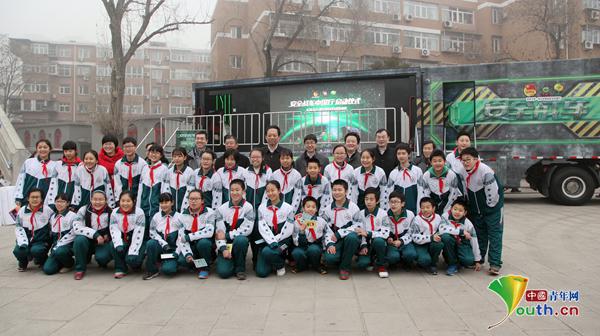 团中央、网信办、360公司相关负责人在“安全战车”前和学生合影。中国青年网记者 李延兵 摄
