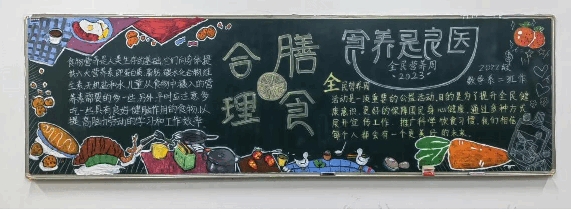 近日,太阳成集团tyc234cc围绕“合理膳食,食养是良医”的主题,以班级为单位开展全民营养周主题黑板报活动,2022级全年级共15个班级参加。