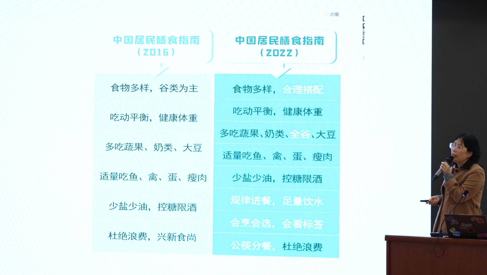 赵文红教授从合理营养的概念出发,分析了各类食物的营养特点,巧妙地结合大学生的营养需求与健康状况,由浅入深地普及营养知识,着重强调了《中国居民膳食指南(2022)》对大学生合理膳食的指导作用。谈及均衡饮食,赵文红说,“每人每天需要摄入的营养素的种类和数量,与人体内所含营养素契合为最佳” 。她强调“营养是过程,营养素才是物质”,这纠正了学生们的认知。数学类专业2022(2)班的张思雨感慨:“今天的科普知识对我近期的减肥计划有很大帮助,让我以更科学的方式调整体重。”