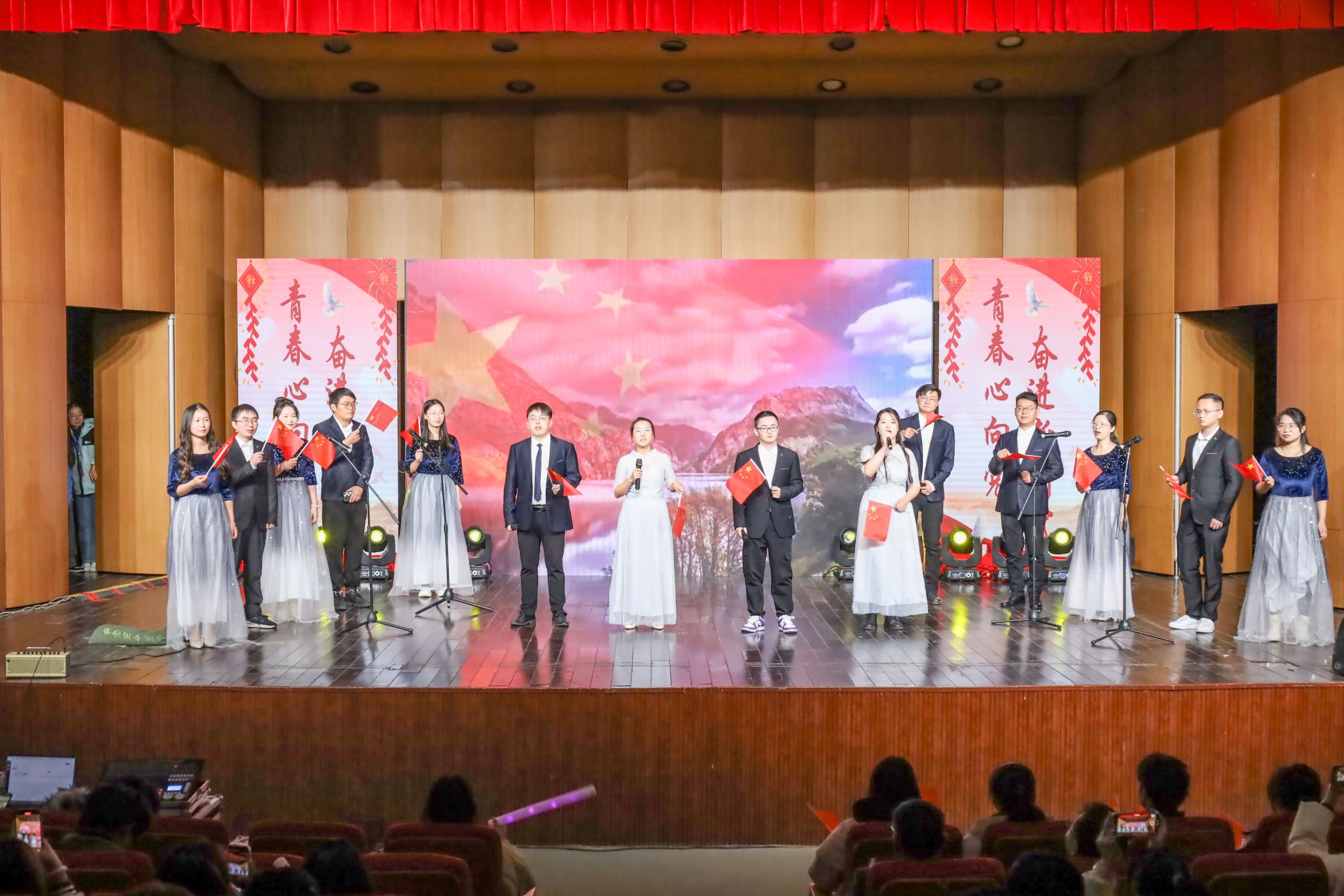 晚会由“春风化雨,风华正茂”“青春向党,奋进担当”“舞动青春,不负韶华”“向阳追梦,扬帆远航”四个部分组成。除了现场观看演出外,学生可以通过抖音直播“云”赏这场“视听盛宴”。军训动员、各类宣讲会、运动风采……晚会现场的大屏幕上播放着师生参与特色活动的精彩瞬间。