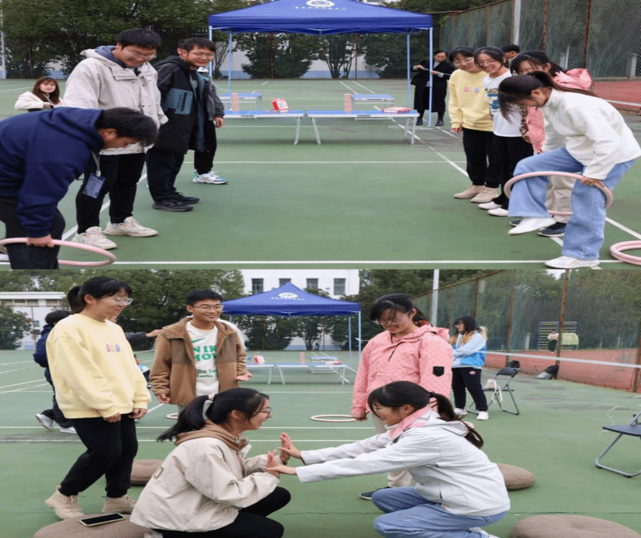 “四个人一组,最先将呼啦圈传送完毕的小组即可获胜。”继第一关“闯关”成功后,工作人员积极引导参赛学生进行接力呼啦圈的比拼。数学类专业2023(1)班的陈浩翔与朋友们手牵手,通过组员间的默契配合与灵活的身体协调,成功将呼啦圈不间断地传到了最后一位学生的身上。从踏入大学校门至今,这是陈浩翔首次参与团队竞赛。“团队游戏不仅是同学之间的感情‘升温剂’,更是心理压力的‘释放器’。”陈浩翔笑称。