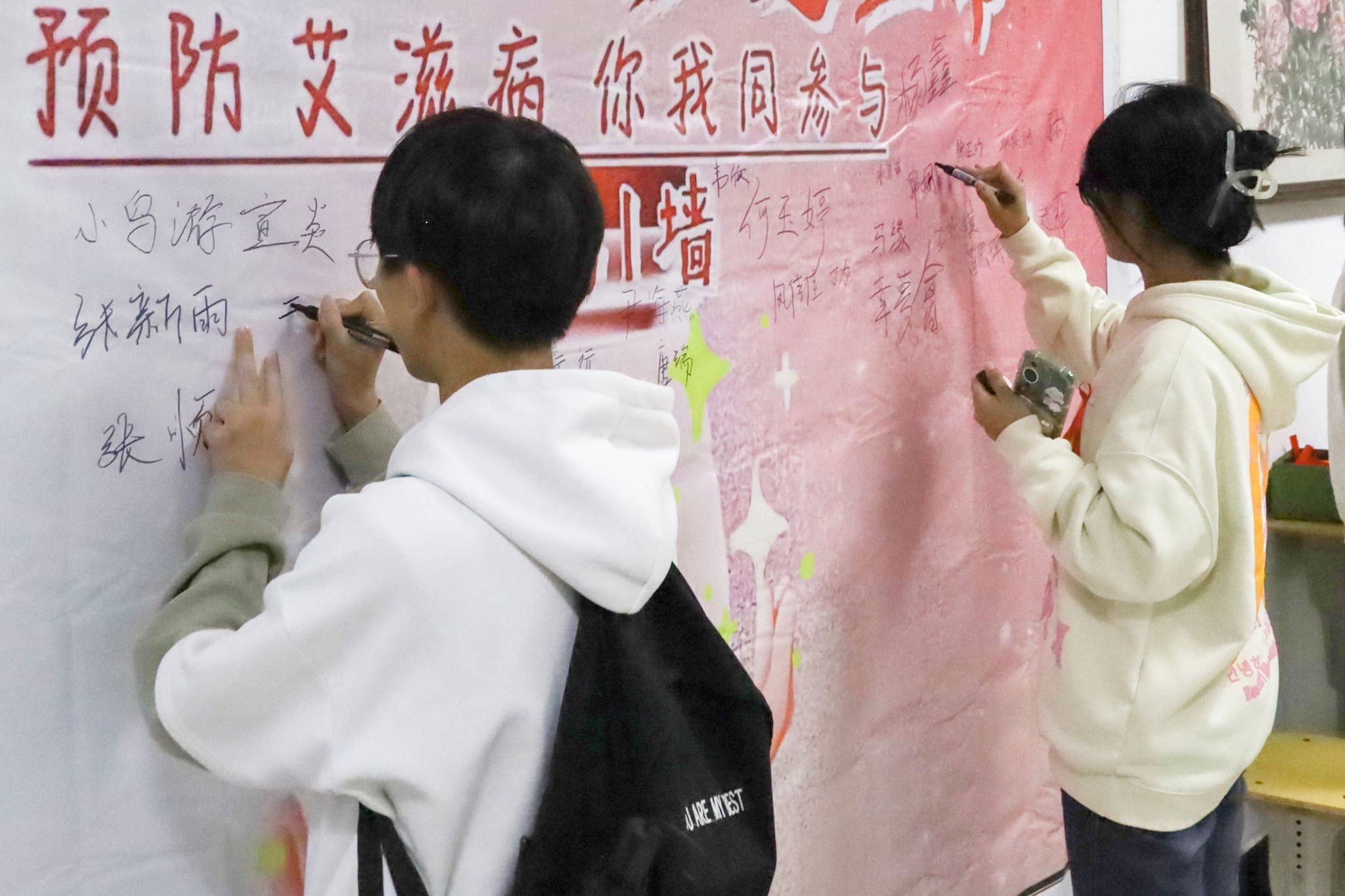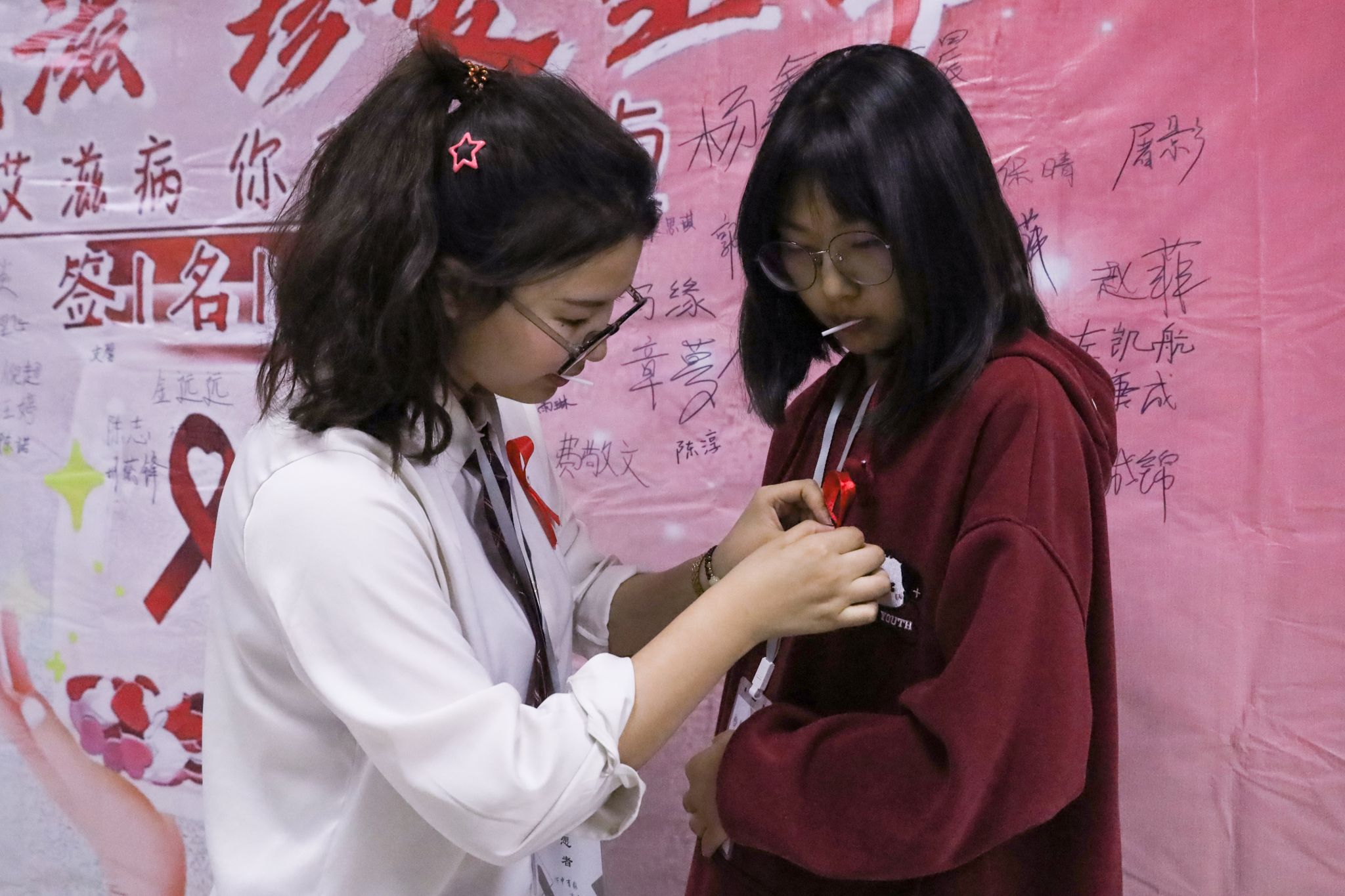 “红丝带是艾滋病防治的象征。”讲座开始前,学生工作人员为前来聆听讲座的学生介绍有关艾滋病的基本知识,并积极引导学生们佩戴红丝带,前往题为“预防艾滋,珍爱生命”的签名墙上签字。学生们纷纷将红丝带佩戴在左胸口处,在墙上书写下自己的姓名,用行动对艾滋病说:“No!”