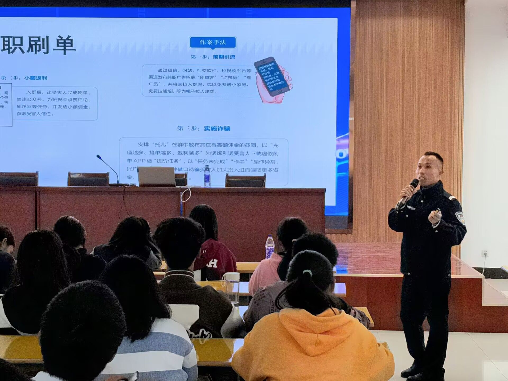 会上,张仲清结合真实案例深入浅出地讲解了防范电信诈骗、防范两卡犯罪、捍卫国家安全和关注心理健康等方面的知识,让同学们对安全问题有了更深入的理解。他从案件类型着手,介绍了电信诈骗的各种手段,并提醒同学们时刻保持警惕,做到不轻信、不转账、不贪不占、洁身自好,呼吁同学们遇事冷静,及时向老师求助,遵守法律法规,避免步入歧途。他还指出:青年应培养自己的责任感和使命感意识到国家安全的重要性,增强爱国主义情感。