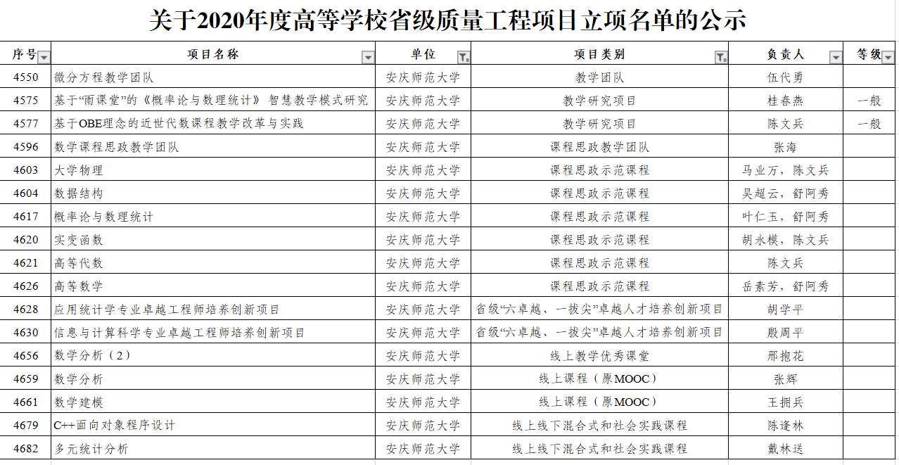 12月28日,安徽省教育厅发布了2020年高等学校省级质量工程项目立项名单。太阳成集团tyc234cc2020年省级质量工程项目获批17项。太阳成集团tyc234cc省级示范基层教学组织(教研室)获批2个、省级教学示范课获批11门。