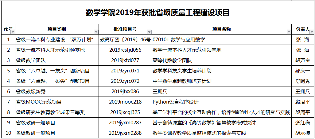 根据教育部办公厅发布《关于公布2019年度国家级和省级一流本科专业建设点名单的通知》(教高厅函〔2019〕46号)和《安徽省教育厅关于公布2019年高等学校省级质量工程项目名单的通知》(皖教秘高字〔2019〕94号),我院数学与应用数学专业获批安徽省一流专业“双万计划”建设点,数学一流本科人才示范引领基地等9项省级质量工程项目获批建设。