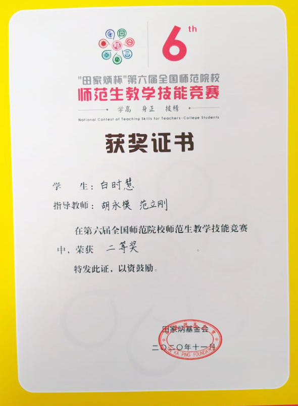 决赛分语文、英语、数学、化学、生物、物理六个学科竞赛组举行。参赛选手们现场抽取课题,在两个半小时内独立完成教学设计、多媒体课件制作,并依次进行3分钟即兴演讲、8分钟模拟上课、书写板书。白时慧同学不畏强手,依靠扎实的专业基础知识和良好的综合素质,教学设计新颖、教学环节完整、教态大方自然,教学难点讲解深入透彻,课堂氛围活跃,充分展示了我校师范生的扎实的教学基本技能及良好的综合素质,荣获二等奖。