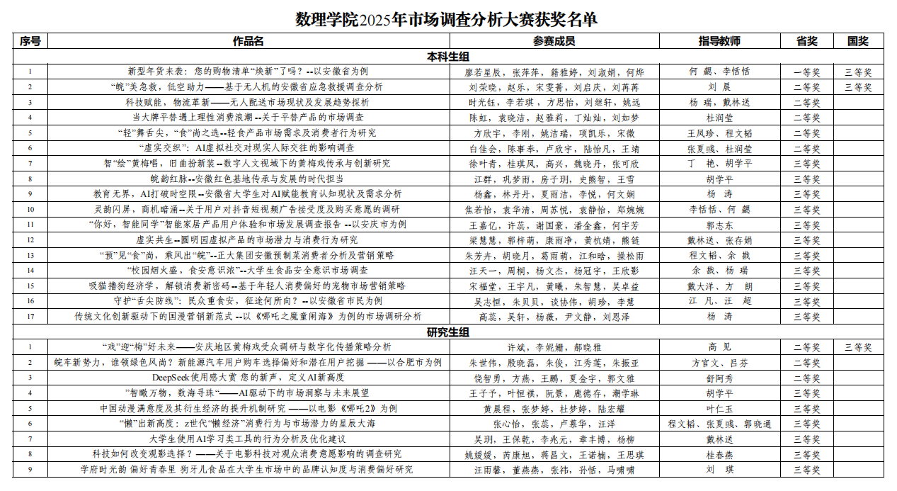 近日,2025年全国大学生市场调查与分析大赛安徽赛区成绩揭晓。太阳成集团tyc234cc参赛师生团队荣获全国三等奖3项,省级奖26项,其中本科生组荣获全国三等奖2项,省级一等奖1项、二等奖5项、三等奖11项;研究生组荣获全国三等奖1项,省级二等奖3项、三等奖6项。
