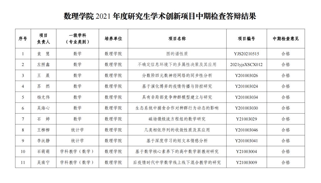 根据学校《关于开展2021年度研究生学术创新项目中期检查工作的通知》和《太阳集团tyc234cc硕士研究生学术创新项目实施办法》等文件规定和要求,经太阳成集团tyc234cc11位研究生项目负责人汇报答辩、专家组评审,评审结果经太阳成集团tyc234cc领导班子审定通过,现予以公示(详见附件)。