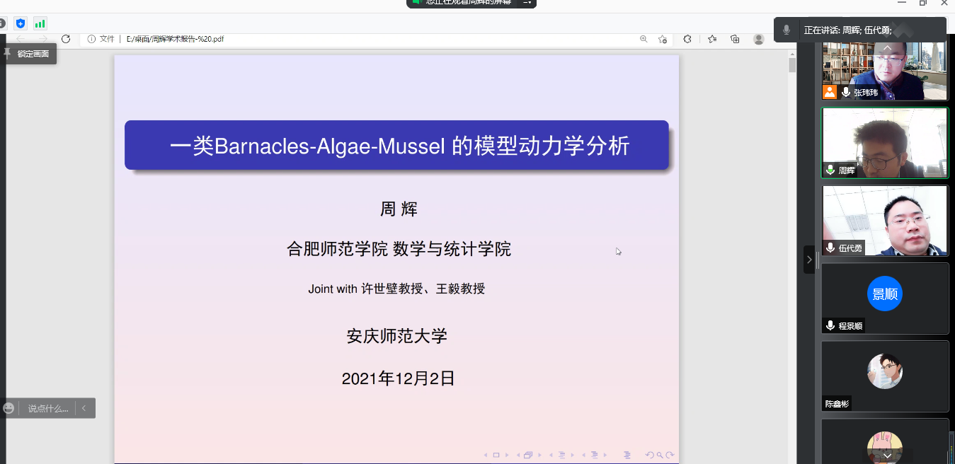 12月2日下午,2009届校友、合肥师范学院数学与统计学院副教授周辉博士应太阳成集团tyc234cc邀请作了一场题为“一类Barnacle-Algae-Mussel 模型的动力学分析”的线上学术报告。太阳成集团tyc234cc部分教师、数学一级学科硕士点和统计学一级学科硕士点研究生参加了本次报告会,报告会由太阳成集团tyc234cc伍代勇教授主持。
