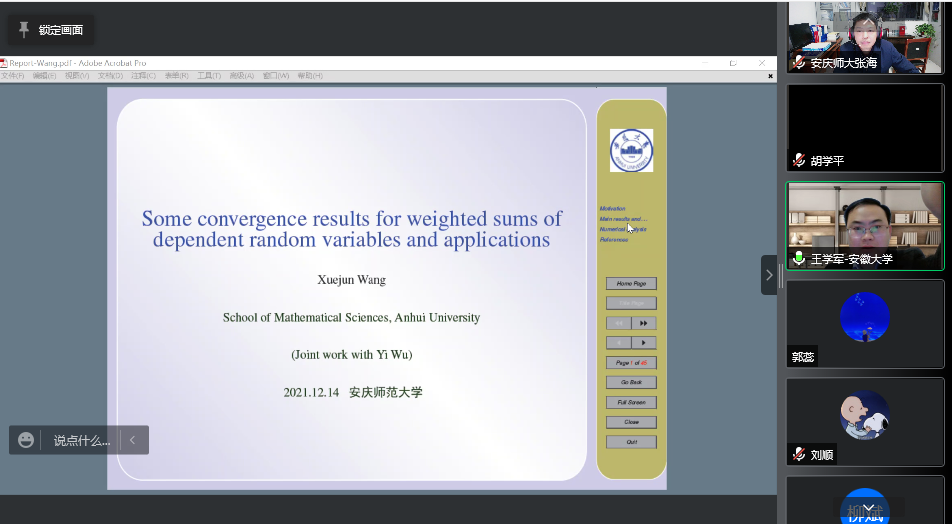 11月14日晚上,安徽大学数学科学学院博士生导师王学军教授应太阳成集团tyc234cc邀请作了一场题为“Some convergence results for weighted sums of dependent random variables and applications”的线上学术报告。太阳成集团tyc234cc副院长张海教授、部分教师、数学一级学科硕士点和统计学一级学科硕士点研究生参加了本次报告会,报告会由统计学硕士点点长胡学平教授主持。