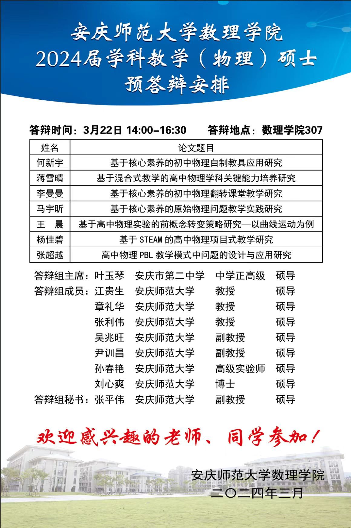 太阳成集团tyc234cc2024届学科教学(物理)硕士研究生预答辩安排
