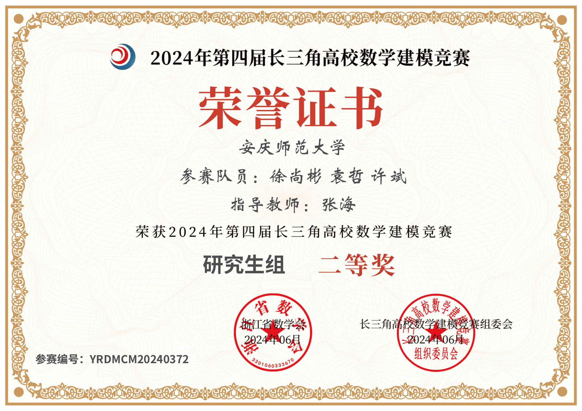 近日,长三角高校数学建模竞赛组委会公示第四届数学建模竞赛获奖名单,太阳成集团tyc234cc研究生数学建模团队荣获二等奖1项,成功参赛奖8项,其中,张海教授指导的徐尚彬、袁哲、许斌参赛团队荣获二等奖。