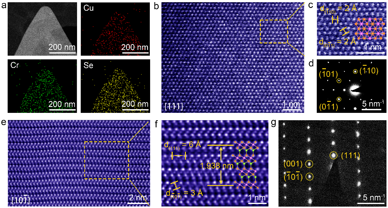 利用高分辨球差电子显微镜对合成的CuCrSe2样品晶体结构进行研究。图3a显示了超薄CuCrSe2纳米片的低分辨射电子显微镜图像,其中能谱(EDS)图体现出CuCrSe2中Cu、Cr和Se元素均匀分布,证明获得了高质量CuCrSe2晶体。图3b给出沿[111]晶轴方向的CuCrSe2纳米片平面STEM图,这与预测的CuCrSe2晶体模型一致。图3d中CuCrSe2沿[111]轴向对应的SAED花样证实了所合成样品为高质量单晶。CuCrSe2纳米片沿[10-1]晶轴方向的HAADF-STEM图如图3e所示。显然,Cu原子插层进入到CrSe2层间,与CuCrSe2晶体的模拟截面STEM图相吻合。此外,对应的SAED花样(图3g)与模拟原子结构的傅立叶变换(FFT)花样(图S7)相一致,这表明所合成的CuCrSe2的原子结构与理论模型一致。