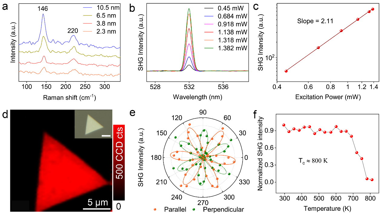 图2.CuCrSe2纳米片的拉曼光谱和SHG表征