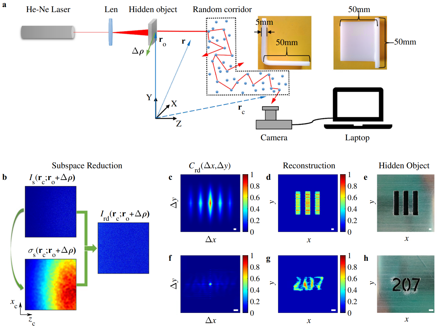 图1:成像位于随机走廊一个拐角后的隐藏目标。a 实验成像系统原理图。b 激光散斑光强照片子空间约化示意图。c,f 散斑光强关联函数。d,g 重建出的隐藏目标图像。e,h 隐藏目标实物照片。