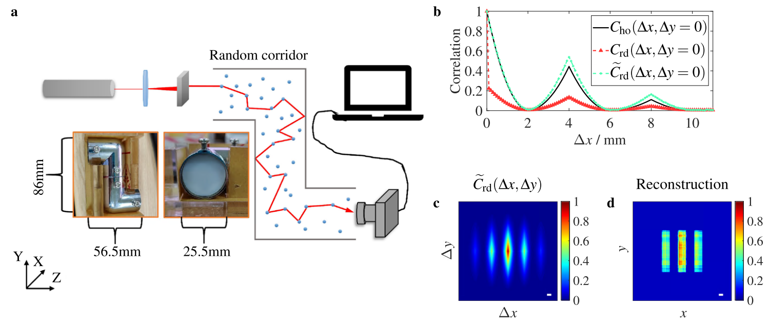图2:成像位于随机走廊两个拐角后的隐藏目标。a 实验成像系统原理图。b 隐藏目标自关联函数、散斑光强关联函数、重整化散斑光强关联函数三者的对比。c 重整化散斑光强关联函数。d 由重整化散斑光强关联函数重建出的隐藏目标图像。