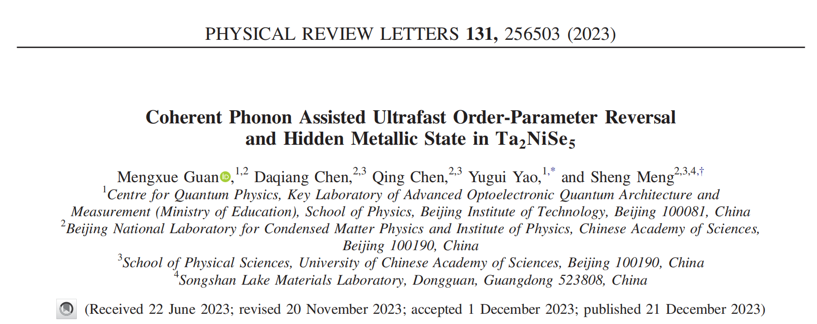 近期,北京理工大学物理学院姚裕贵、关梦雪特别研究员和中国科学院物理研究所的孟胜研究员团队展开合作,利用非绝热含时密度泛函分子动力学(TDDFT-MD)方法深入探究了Ta2NiSe5中的非平衡多体相互作用。研究明确了晶格序参量在光诱导绝缘体-金属转变过程中的关键作用,为理解关联量子材料中激子-声子动力学提供了全面的视角。相关研究题目为《Coherent Phonon Assisted Ultrafast Order-Parameter Reversal and Hidden Metallic State in Ta2NiSe5》,成果被发表在物理学领域的顶级期刊Physical Review Letters上。