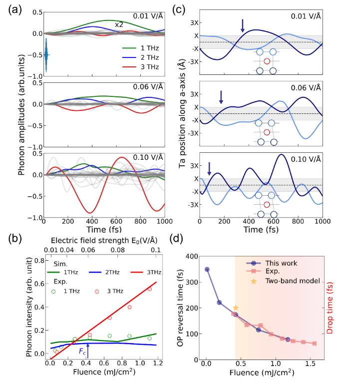 图2. 声子激发及诱导的晶格序参量反转,并与实验结果进行对比。